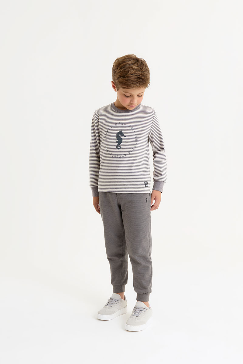 A Camiseta Onda Marinha é aquela peça versátil que não pode faltar no guarda-roupa dos meninos de 4 a 8 anos. Confeccionada em malha listrada, combina estilo atemporal com um toque moderno. A estampa de cavalo marinho traz personalidade e referência ao universo marítimo, marca registrada da Onda Marinha.