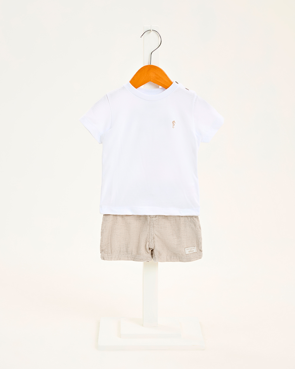 O Conjunto Onda Marinha foi criado para garantir praticidade e estilo nos dias mais quentes. A camiseta de manga curta possui estampa nas costas e abertura em botões na gola, facilitando na hora de vestir o bebê. A bermuda em tecido leve combina algodão, viscose, liocel e linho, proporcionando um toque suave e respirável. Ideal para roupas de sair e conjuntos para festas, é uma opção encantadora e funcional para os pequenos explorarem o mundo com conforto.