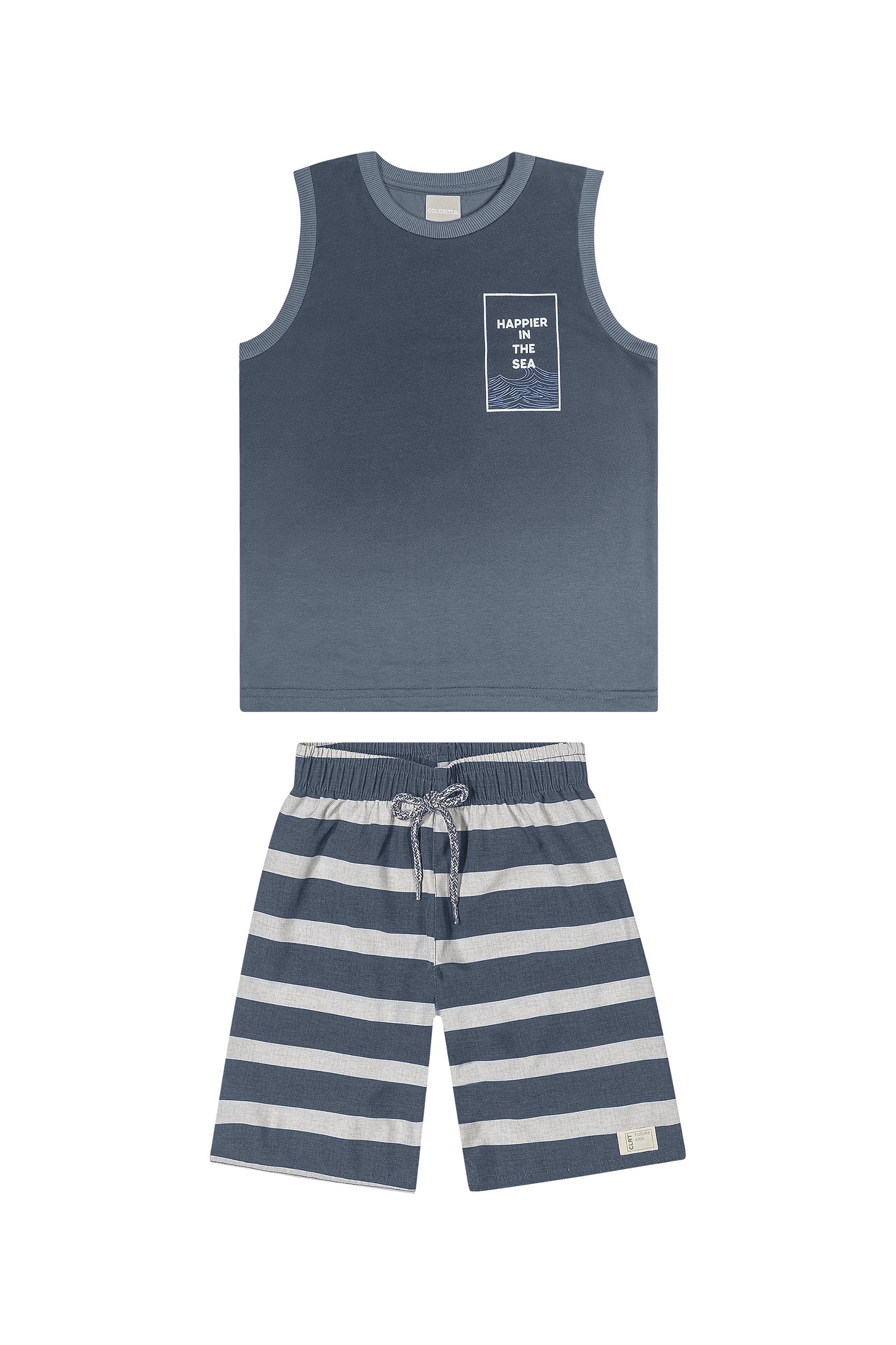 Conjunto Colorittá - Regata com estampa e malha degrade, bermuda d'água listrada.