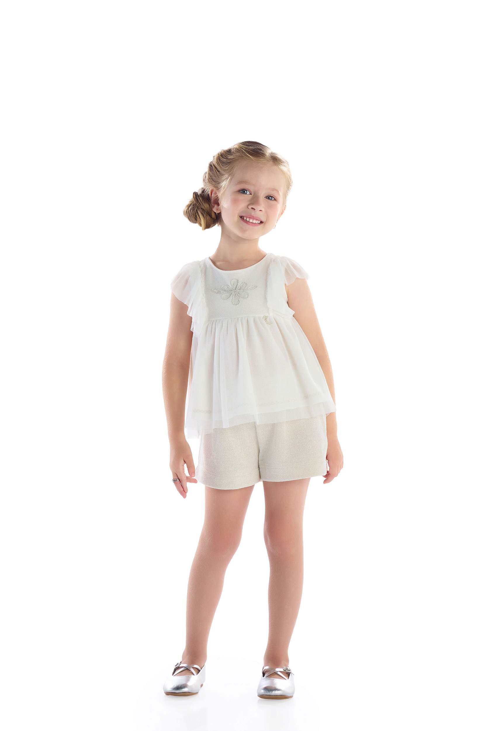 O Conjunto Kiki combina romantismo e elegância em cada detalhe. A bata off-white é confeccionada em tecido leve, com aplicações em tule e bordado prata que trazem um toque iluminado ao look. O shorts com brilho suave complementa o visual com conforto e delicadeza, perfeito para aniversários, batizados e como opção encantadora de roupa de sair ou conjunto para festas para meninas pequenas.