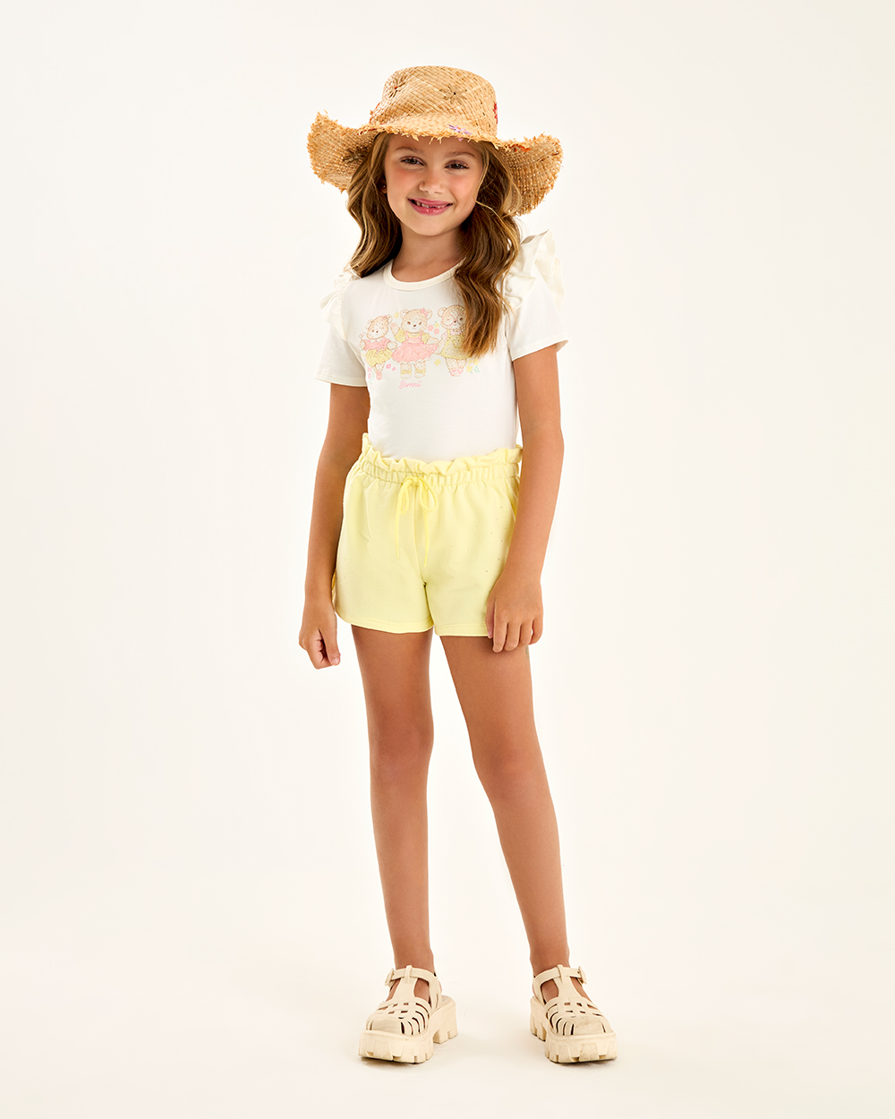 O Conjunto Somnii combina charme e delicadeza em um look que encanta desde o primeiro olhar. A blusa de manga curta traz babadinhos nos ombros e uma estampa de ursinhos com aplicações de strass, deixando o visual ainda mais especial. O shorts em moletom, com strass na parte da frente, oferece conforto e um toque brilhante que as meninas adoram. Perfeito como roupa de sair ou até mesmo como um conjunto para festas, é um look versátil, leve e cheio de personalidade.