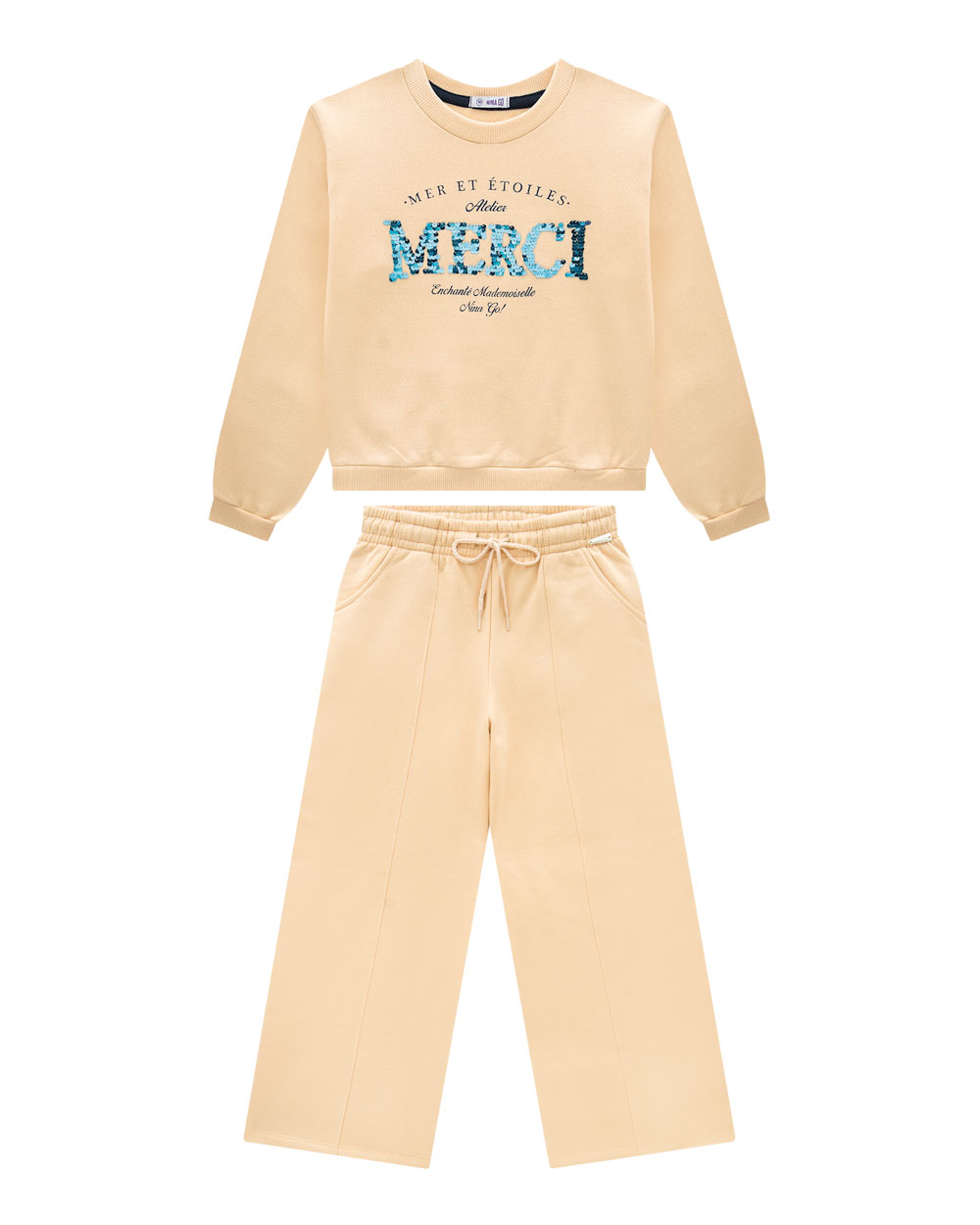 Moderno, sofisticado e cheio de atitude, o conjunto juvenil Nina Go é a escolha perfeita para meninas que amam brilhar. A blusa em moletom flanelado com lantejoulas bordadas traz um toque glam na medida certa, ideal como roupa de sair para ocasiões especiais. A calça wide leg em moletom flanelado, com bolsos e plaquinha metalizada, completa o look com caimento atual e confortável.