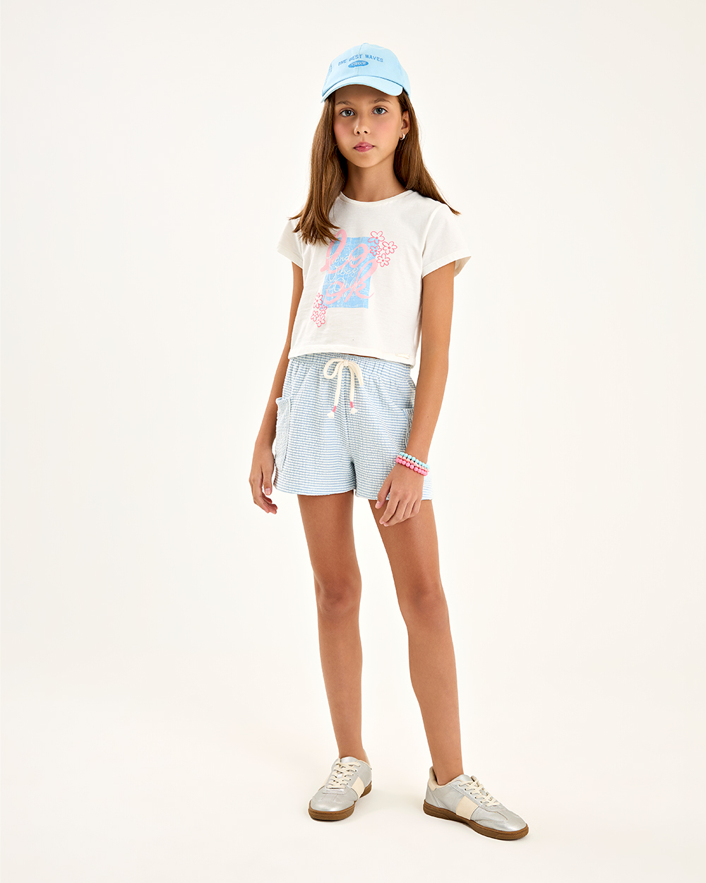 O Conjunto Nina Go é perfeito para meninas modernas que adoram unir estilo e conforto no dia a dia. A blusinha de manga curta com estampa frontal traz um toque divertido e cheio de personalidade, enquanto o shorts listrado em malha canelada oferece liberdade de movimento e um caimento impecável. Ideal como roupa de sair ou conjunto para festas, essa combinação traduz o equilíbrio entre delicadeza e atitude que define a moda teen da Nina Go.
