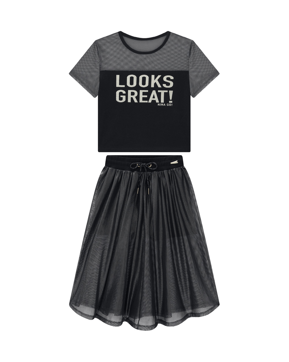 O Conjunto Nina Go foi criado para meninas de 6 a 12 anos que adoram se destacar com elegância e autenticidade. A blusinha de manga curta combina o conforto do algodão com o charme da telinha metalizada, enquanto a saia midi no mesmo tecido traz movimento e sofisticação ao look. Um conjunto versátil, perfeito como roupa de sair ou até mesmo como conjunto para festas, transformando aniversários, eventos escolares e ocasiões especiais em momentos cheios de estilo.