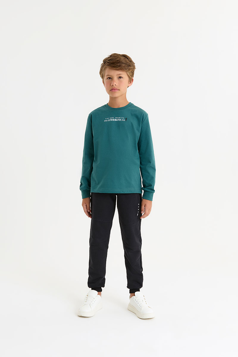 O Conjunto Onda Marinha é a escolha ideal para meninos de 4 a 8 anos que buscam conforto e estilo no dia a dia. A camiseta manga longa em malha 100% algodão traz escrita na parte da frente, adicionando personalidade e um toque moderno ao visual.