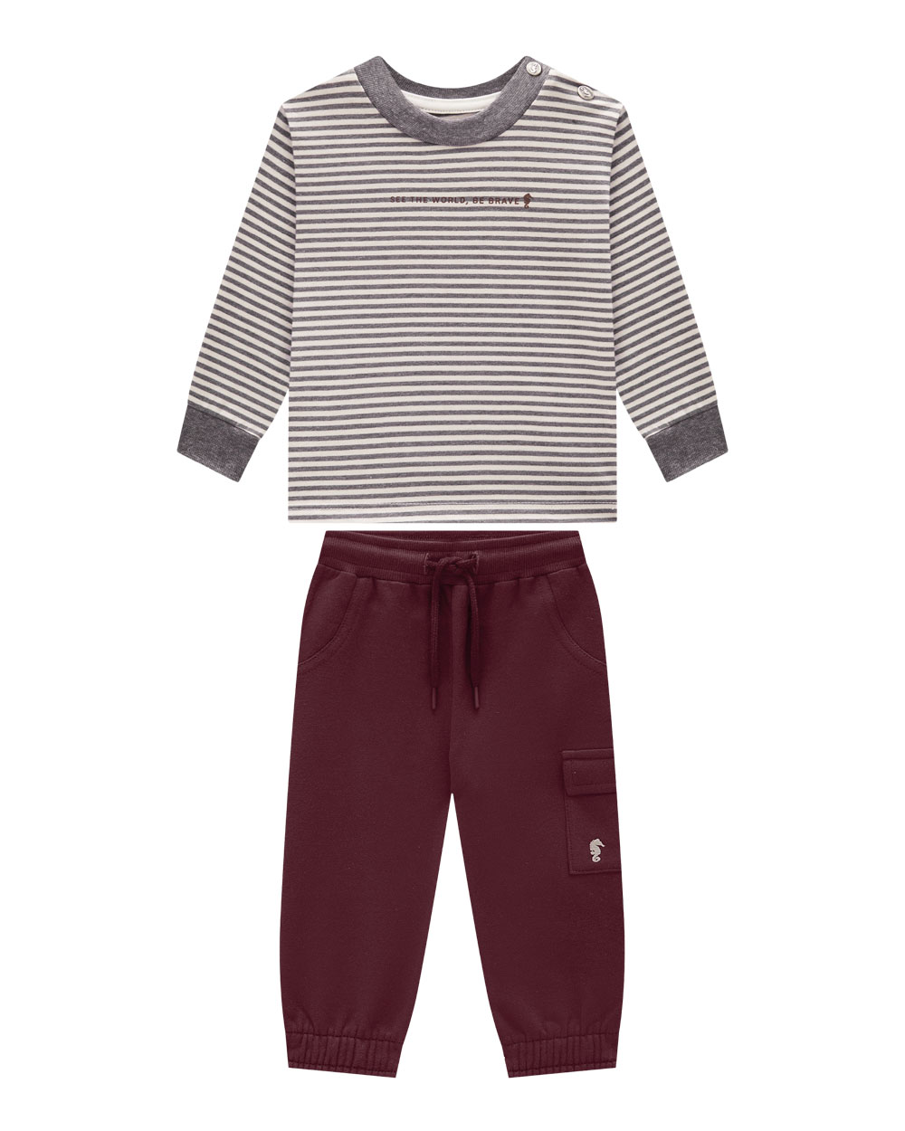 O Conjunto Onda Marinha é perfeito para bebês e crianças de 0 a 3 anos que buscam conforto e estilo. A camiseta manga longa em malha listrada garante maciez e liberdade de movimento, ideal para o dia a dia ou passeios em família.