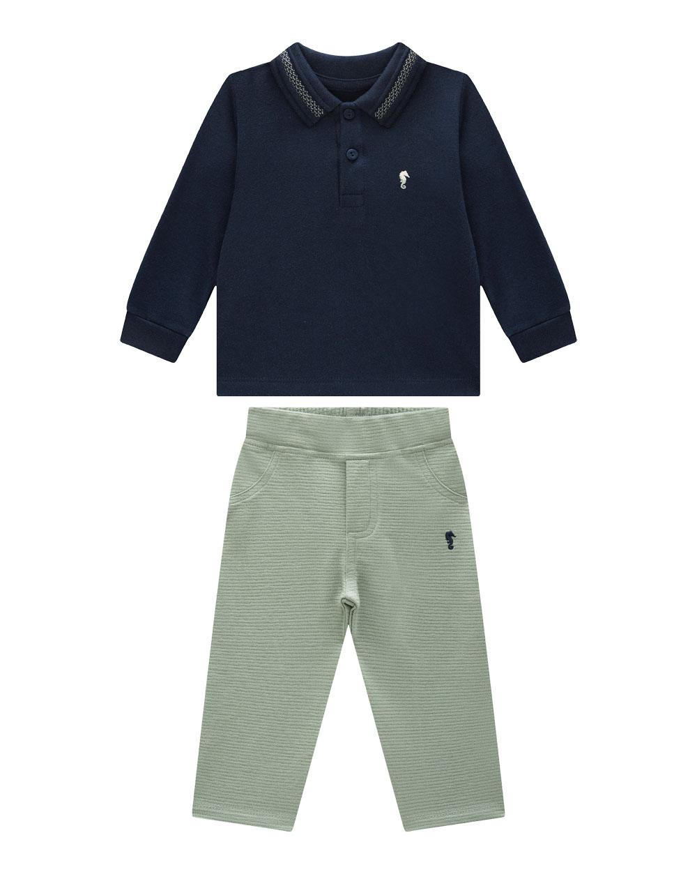 O Conjunto Onda Marinha é perfeito para meninos de 1 a 3 anos que já esbanjam charme desde os primeiros passos. A camiseta polo manga longa em 100% algodão traz logo bordado, garantindo um visual elegante, confortável e delicado para a rotina dos pequenos.
