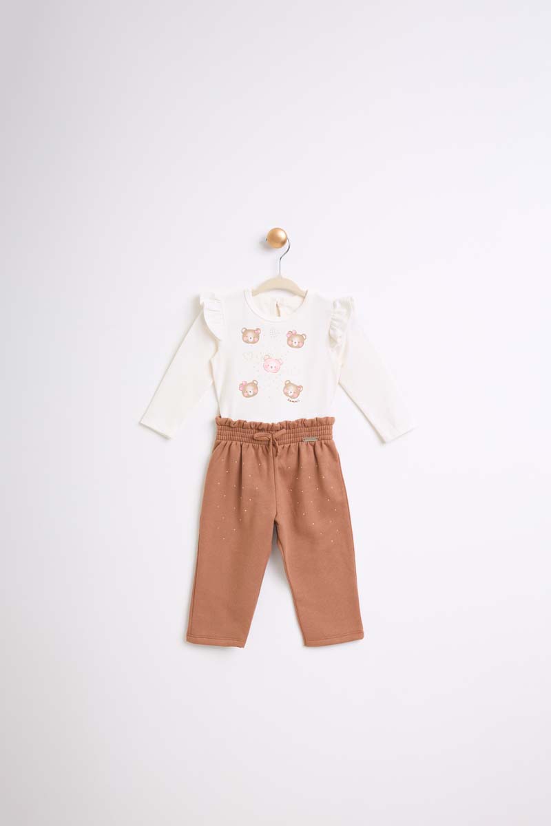O conjunto Somnii foi pensado para vestir os primeiros meses do bebê com suavidade e muito carinho. A blusa manga longa traz estampa delicada de ursos com aplique de strass e babadinhos nos ombros, criando um visual encantador e sofisticado. A calça em moletom flanelado completa o look com toque macio, detalhes em strass e plaquinha metalizada, garantindo conforto e acabamento refinado.