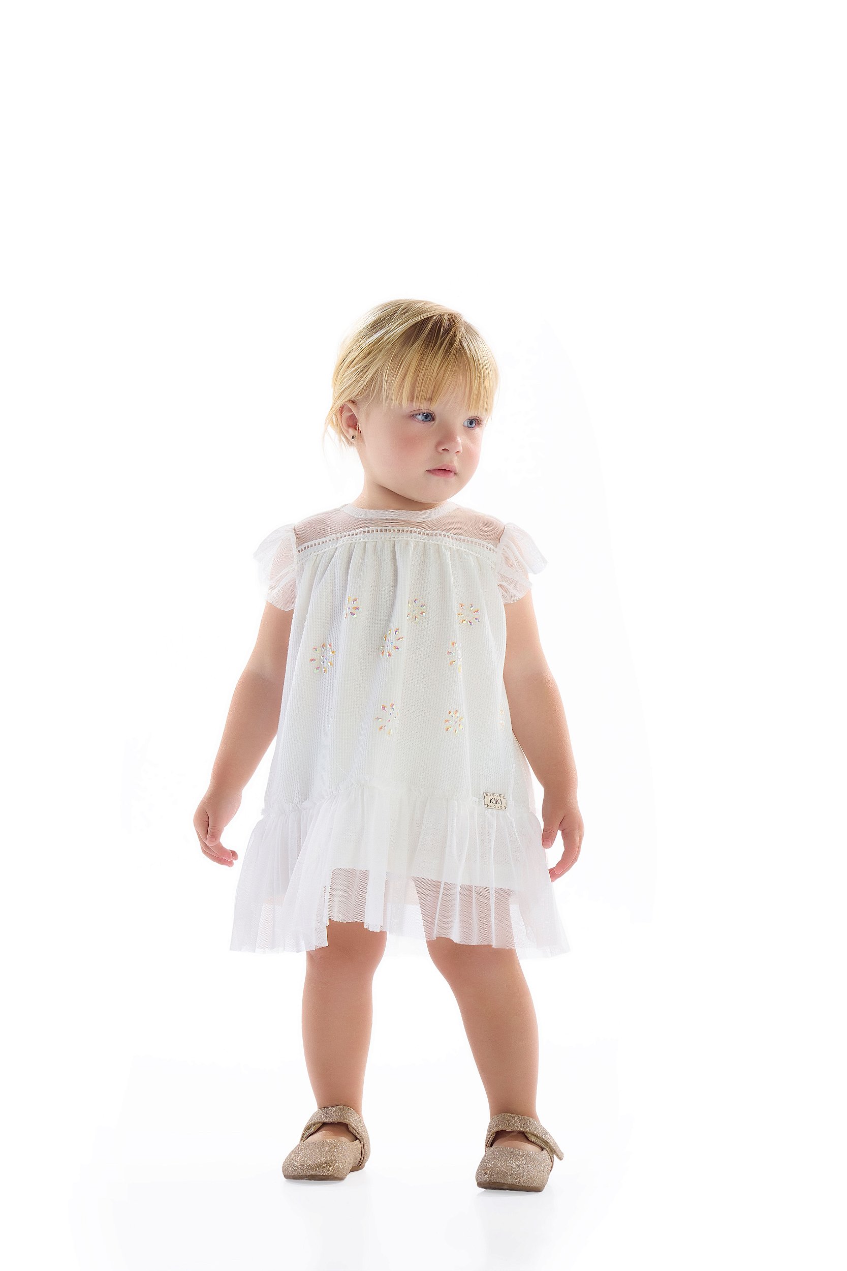 O Vestido Kiki é perfeito para ocasiões em que o encanto faz toda a diferença. Confeccionado em tecido trabalhado com aplique de brilhos, o modelo traz um visual iluminado e sofisticado. Os detalhes em tule criam leveza e movimento, enquanto o forro completo garante conforto para o bebê. Um vestido pensado para cerimônias, aniversários e como a opção ideal de roupa para festa com toque de princesa.