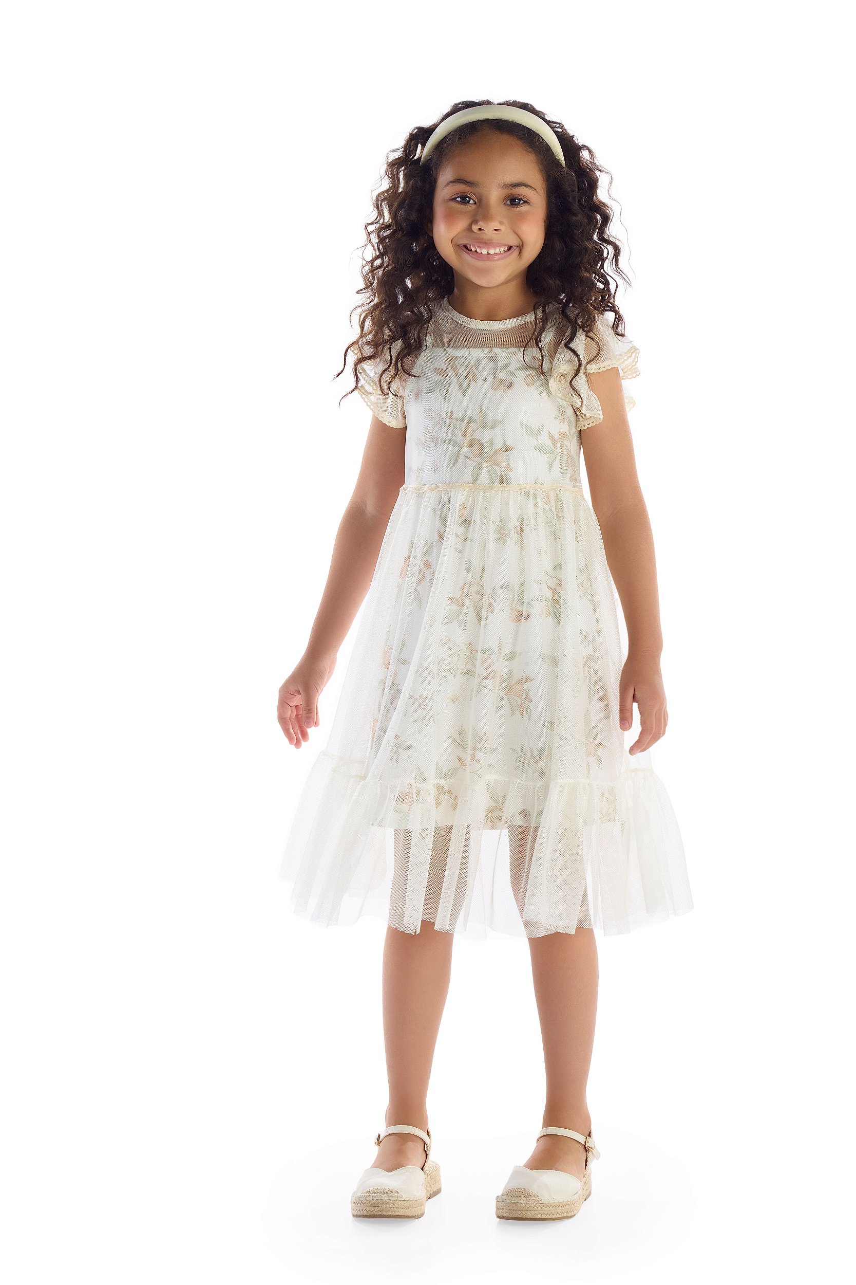 Um vestido infantil encantador em duas peças: base de alça com estampa de folhagens e sobreposição em tule superconfortável, com manga curta e detalhes em crochê nas barras. O caimento leve e o visual sofisticado fazem deste look a escolha ideal de roupas para festas, roupas para passeios e outros momentos especiais como aniversários e batizados. Do 6 ao 12.