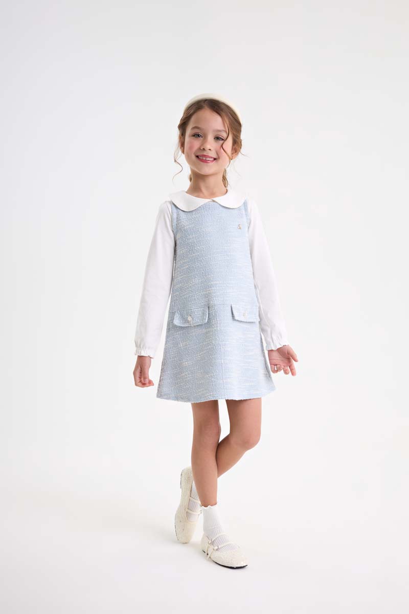 O vestido Somnii é a escolha perfeita para meninas de 4 a 10 anos que querem conforto e elegância. Confeccionado em malha tweed, possui logo metalizado e delicados detalhes em pérola, transmitindo sofisticação em cada look. Acompanha blusa manga longa em malha com gola, garantindo versatilidade e proteção nos dias mais frescos.